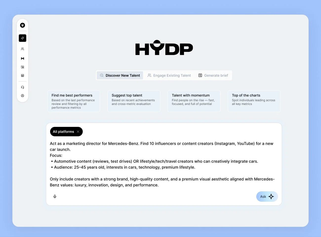 Ultimately, HYDP gives brands a smarter way to run targeted social media campaigns. With AI-driven insights and a design-led interface, the platform enables precise talent discovery, predictive forecasting, and measurable results.